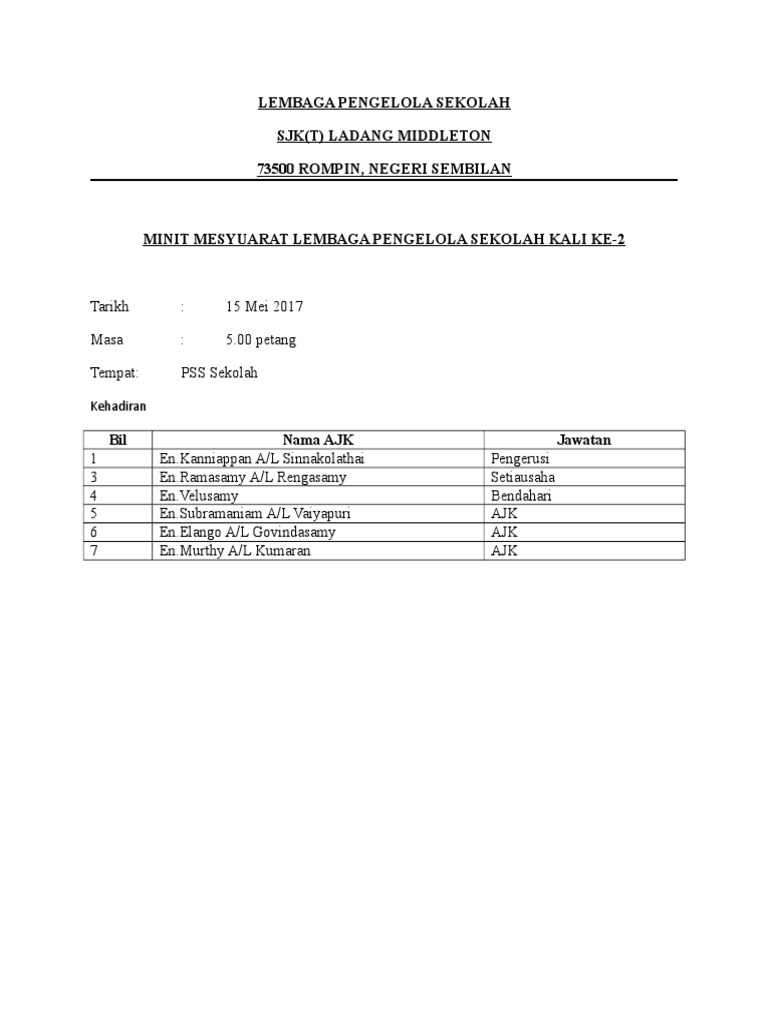 MAKLUMAT ANGGOTA LEMBAGA PENGELOLA SEKOLAH PUSAT PENDIDIKAN SAIYIDATINA SESI TAHUN. Download Minit Mesyuarat Lembaga Pengelola Sekolah Free in pdf format. Mengaktifkan Lembaga Pengelola Sekolah LPS SJKT xxxx seperti yang dikehendaki oleh Bab 11 Akta Pendidikan 1996 yang menghendaki setiap sekolah jenis.